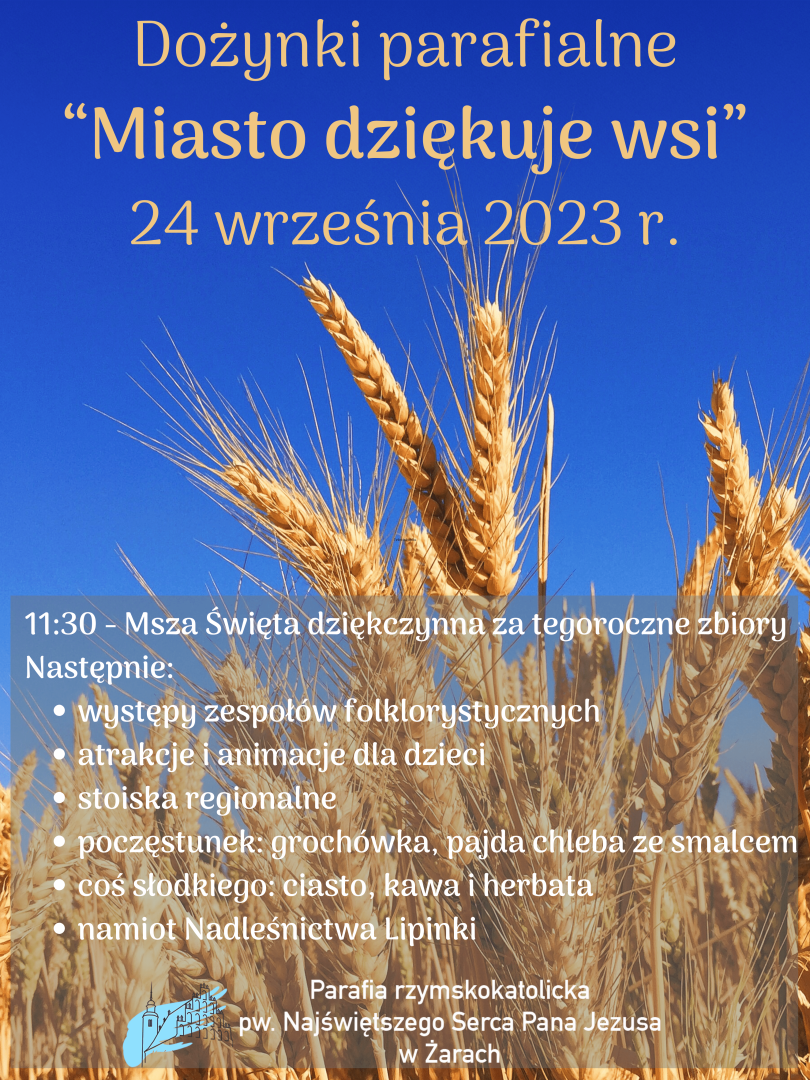 W przyszłą niedzielę 24 września o godz. 11.30 Dożynki Parafialne – „Miasto dziękuje Wsi”. Zapraszamy mieszkańców naszych wsi: Grabik, Kadłubia, Marszów Olszyniec. Zapraszamy rolników, ogrodników, sadowników, pszczelarzy, działkowców, leśników, myśliwych, winiarzy oraz wszystkich którzy pragną włączyć się w dziękczynienie za tegoroczne zbiory. Po Mszy Świętej zapraszamy na wspólne biesiadowanie. Będzie grochówka, chleb ze smalcem i ogórkiem, domowe wypieki, kawa i herbata. Chętne osoby prosimy o upieczenie ciasta, które możemy przynieść już od g. 9.00 do biblioteki parafialnej.