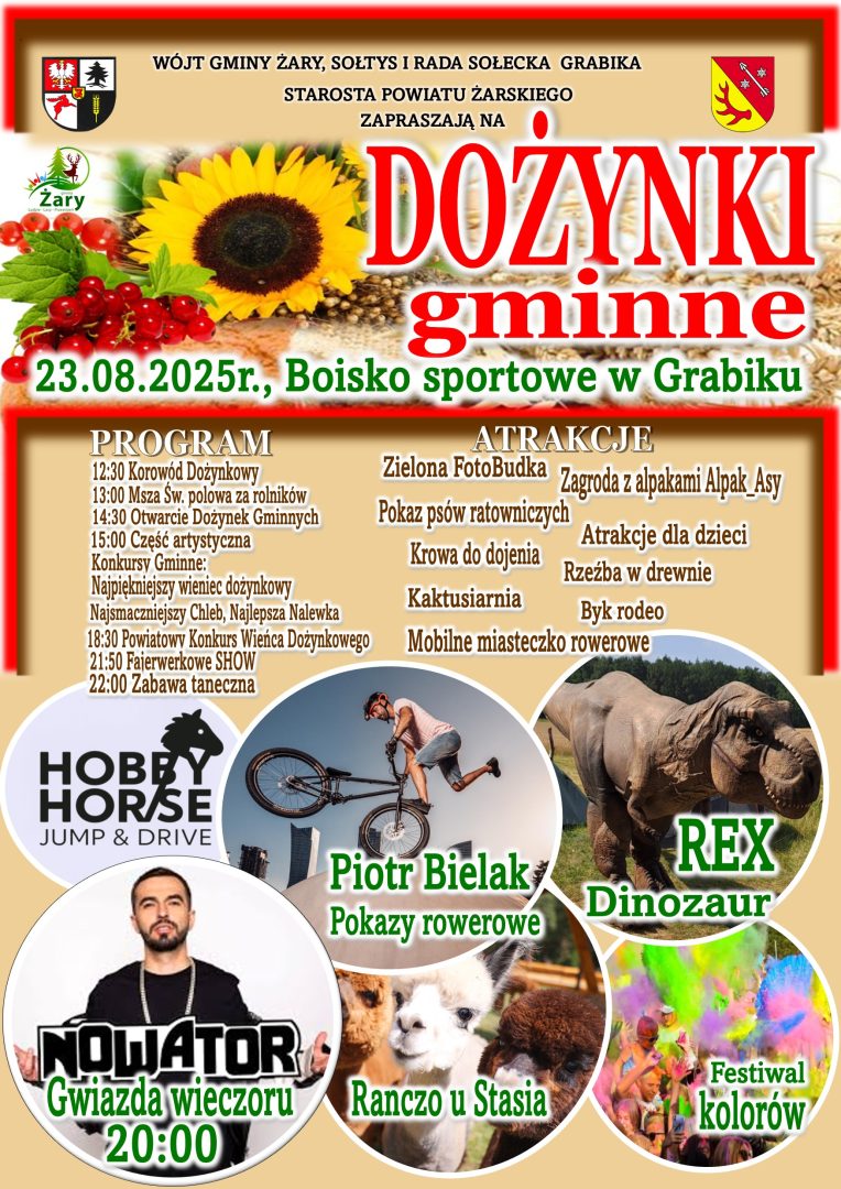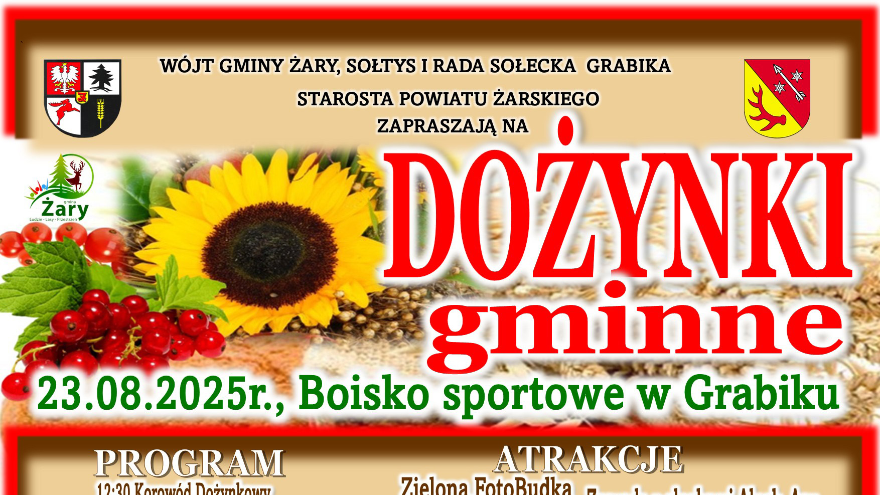 Serdecznie zapraszamy na Dożynki Gminne, które odbędą się 23 sierpnia 2025 r. na boisku sportowym w Grabiku.