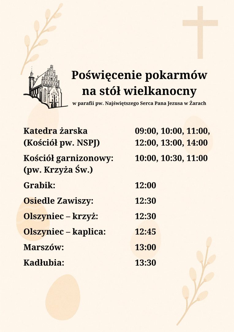 Wielka Sobota:Poświęcenie pokarmów: 10:00, 10:30, 11:00