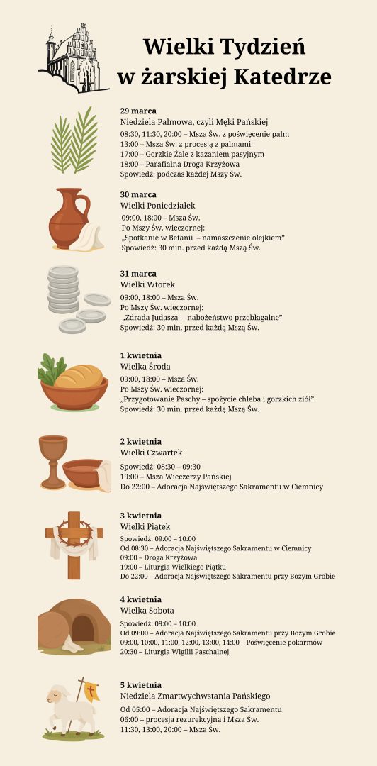 W Wielki Poniedziałek, Wielki Wtorek i Wielką Środę zapraszamy wszytkach Parafian oraz Mieszkańców Żar do udział w nabożeństwach jerozolimskich, które mają na celu przybliżenie ich uczestnikom ostatnich dni Jezusa przed Jego śmiercią na krzyżu.